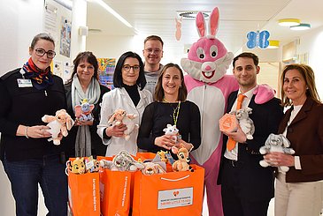 Kurz vor den Osterfeiertagen sorgte eine besondere Überraschung für strahlende Gesichter in der Neuropädiatrie des Uniklinikums Erlangen: Ein pinkfarbener Osterhase stattete den jungen Patientinnen und Patienten der Station 3C einen Besuch ab. Dank liebevoll verpackter Geschenke wie kuschelweicher Plüschtiere, bunter Ostereier und süßer Überraschungen verwandelte sich der Klinikalltag in eine fröhliche Osterwelt. Die Aktion ließ nicht nur die Augen der kranken Kinder leuchten, sondern zauberte auch deren Eltern und dem Stationspersonal ein Lächeln ins Gesicht. Seit Jahren besucht Michele Ficucella, Senior Branch Manager der Firma Sixt am Standort Erlangen-Tennenlohe, das Uniklinikum Erlangen und bringt die Osterüberraschungen der Regine Sixt Kinderhilfe Stiftung persönlich auf die Stationen. Verlässliche Unterstützung erhält die Stiftung dabei von der Simba-Dickie-Group GmbH aus Fürth, die auch dieses Mal wieder zahlreiche Plüschtiere spendete.